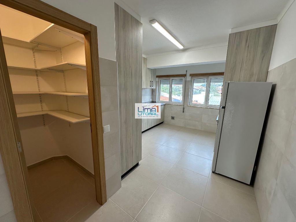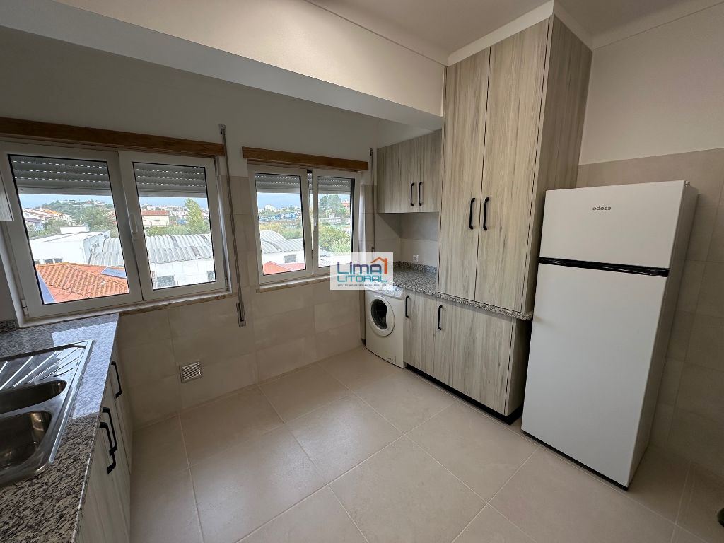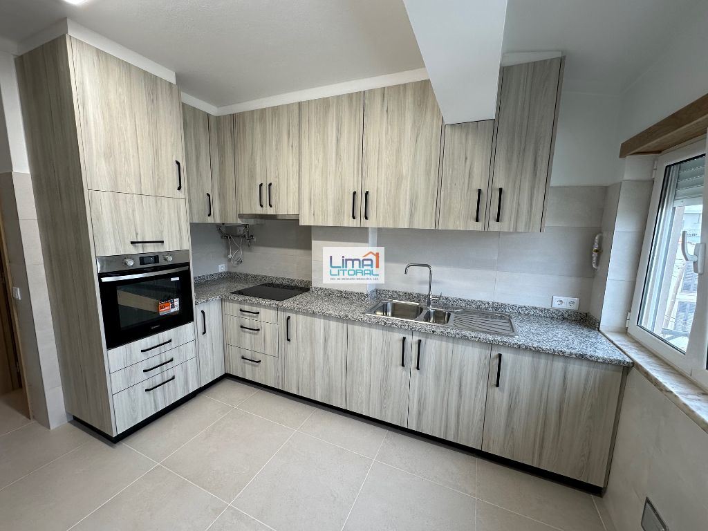 Cozinha equipada com placa, forno, exaustor, esquentador, maquina de lavar roupa e frigorifico.